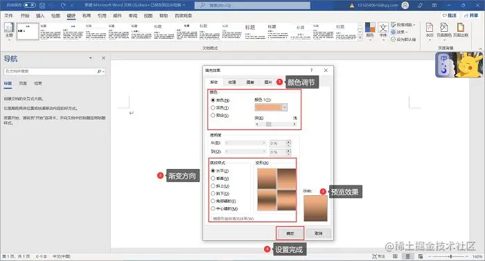 第4步:按自己喜欢的实际标准进行渐变设置,同时还能设置渐变的方向,设置完成后点击“确定”,文档的渐变背景就出来了!