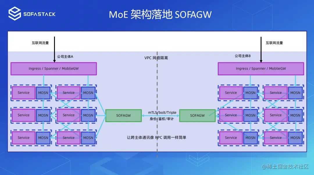 除了 Roadmap 中各种能力上的发展计划,有一个很重要的演进方向是南北向网关接入。MOSN 在 1.0 版本之后会升级到 MoE 的架构,南北向的接入网关是一个更大流量的场景,也将会用新架构的 MOSN 来支持。