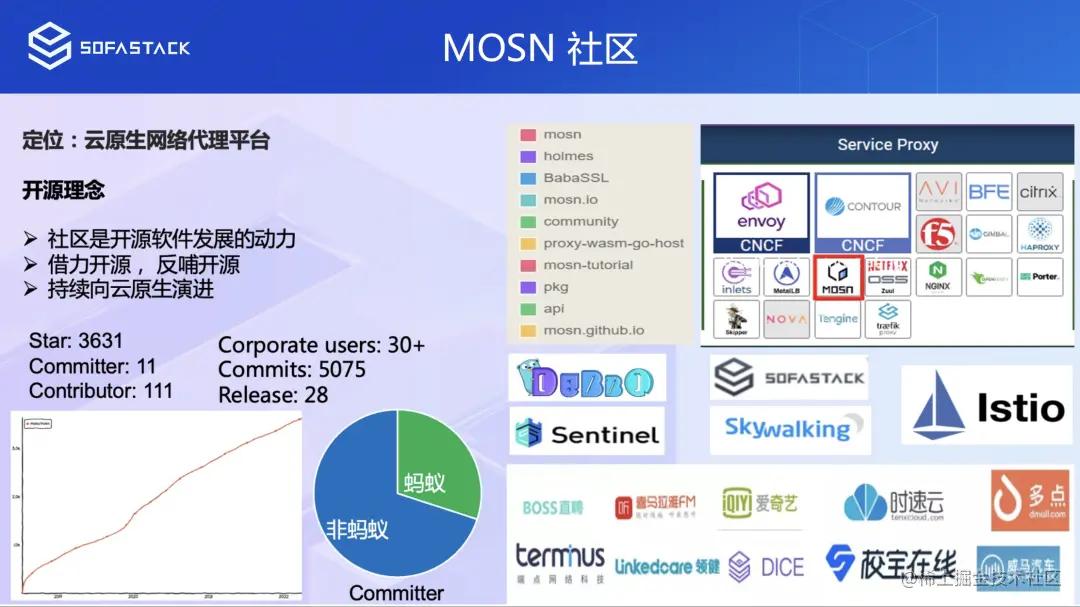 MOSN 除了在蚂蚁内部全面铺开,以及商业化的落地实践,还有逐渐完善的社区。MOSN 社区目前有 11 个 Committer,其中超过 70% 是非蚂蚁的 Committer,有 100 多位的 Contributor,经过了 28 个小版本的迭代。MOSN 还有很多开源的用户,他们将 MOSN 在自己公司落地,也对 MOSN 有很多的贡献。