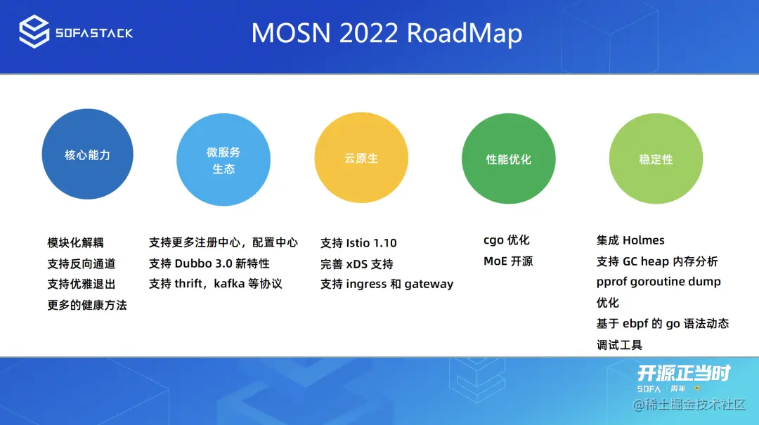 2022 年的 Roadmap 中,除了这种核心能力,比如说我们会做模块化结构, 优雅退出 (这些已经在 1.0 版本里实现了) 。还有各种微服务的生态,也会对接更多的注册中心这种配置中心、云原生、集成 Istio1.10。还特别增加了稳定性建设,随着 MOSN 的用户越来越多,大家对稳定性能力的呼声也越来越高。