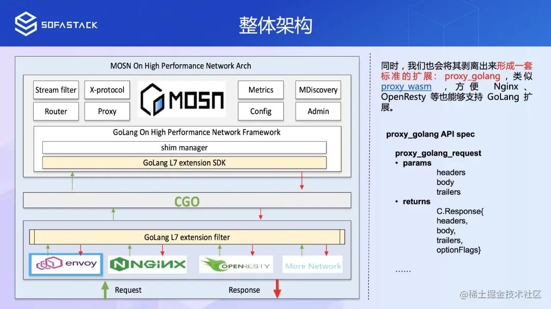 回过头来看整个架构,站在 MOSN 这个角度上来说,Envoy 是作为 MOSN 的网络运行库的角色。请求会先经过网络运行库 (Envoy) ,然后再通过 CGo 这个桥梁,把请求信息交给 MOSN,MOSN 完成请求逻辑之后,再去把响应交回给网络层。