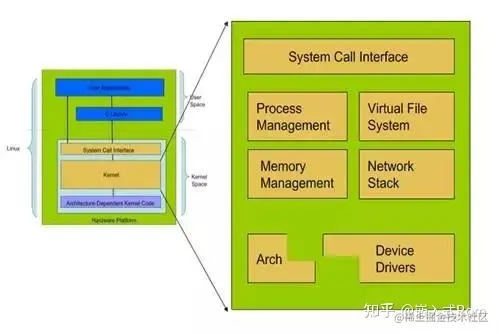 (2)内核空间:内核空间包括,系统调用,内核,以及与平台架构相关的代码