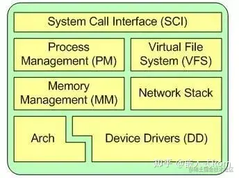 Linux内核的主要组件有:系统调用接口、进程管理、内存管理、虚拟文件系统、网络堆栈、设备驱动程序、硬件架构的相关代码。