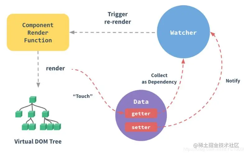 每个组件实例都有相应的 watcher 实例对象,它会在组件渲染的过程中把属性记录为依赖,之后当依赖项的 setter 被调用时,会通知 watcher 重新计算,从而致使它关联的组件得以更新。
