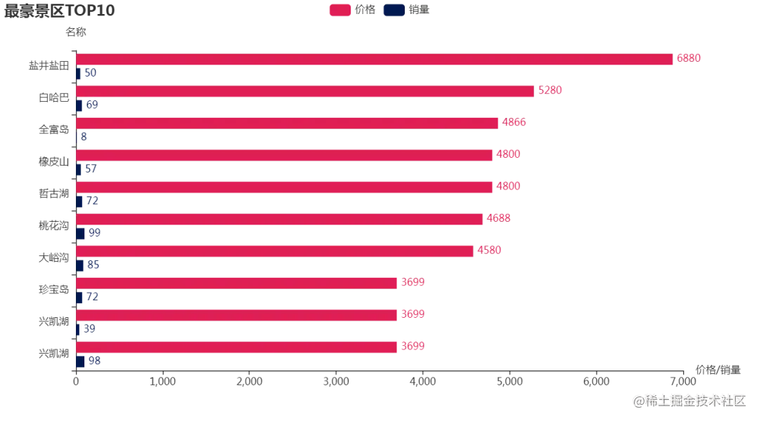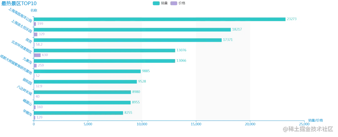 我们再看一下票价 TOP10 景区有哪些?它们的销量怎么样呢?主要代码实现如下:
