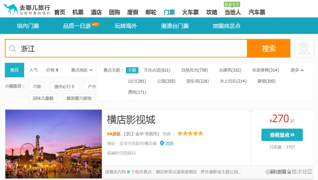 首选,我们打开网址:piao.qunar.com,在搜索框输入一个省级行政区划进行搜索,以浙江为例,如图所示: