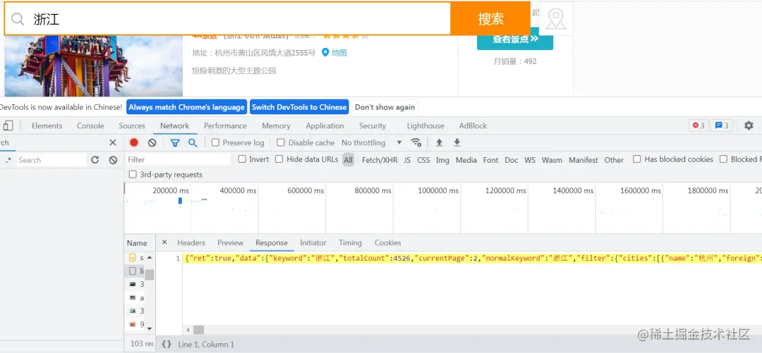 通过观察 URL 我们可以看出 keyword 和 page 是动态的,一个是输入条件值,另一个是页码值,当我们需要翻页爬取时可以进行动态赋值,再将开发者工具切到 Response,我们可以发现返回的数据是 JSON 格式的,如图所示: