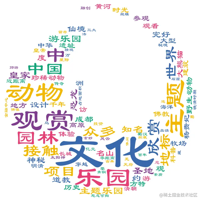 再接着看热门景区的介绍情况,这里我们选取 T100 数据,通过词云来看一下。主要实现代码如下: