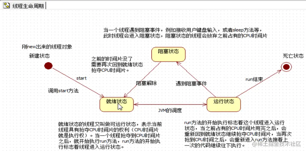 ·运行状态:当CPU时间片(执行权)用完之后,线程会重新回到就绪状态,继续抢夺执行权,当再次抢夺执行权成功之后,线程又会重新进入运行状态,以此类推;