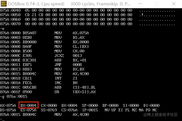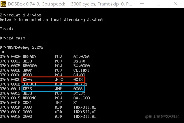 红色部分为 jcxz 指令及其对应的机器码,机器码 E305 中的 E3 为操作数、05 表示转移位移,往后数 5 个字节刚好为指令 mov dx,ax 的地址。同理,蓝色部分为 jmp 指令及其对应的机器码,机器码 EBF5 中的 EB 为操作数、F5 表示转移位移,F5 是负数 -11 的补码,往前数 11 个字节刚好为 mov cl,ds:[bx] 的地址。