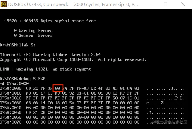 实验要求从 075A:0000 处开始查找第一个值为 0 的字节,可使用 jmp 指令或循环指令完成,找到满足条件的字节后,通过 jcxz 的特性转移并退出程序。整体代码为: