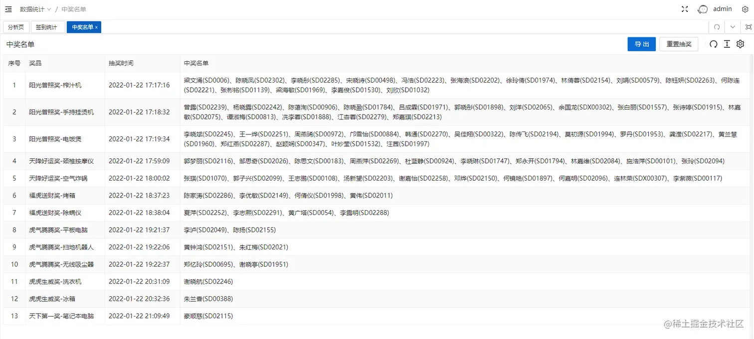 其实开发类似这种系统相对是非常简单的,主要是收集用户的信息,我们是以钉钉上的信息为准(钉钉工号、姓名等信息),录入系统,前端会提供一个扫码观看年度回顾的接口,用户扫码之后会签到,只有到场签到后的用户才能有资格抽奖,后台会提供一个抽奖算法实现抽奖功能,触发后通过算法计算返回前端对应的中奖用户信息。