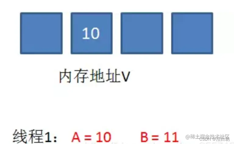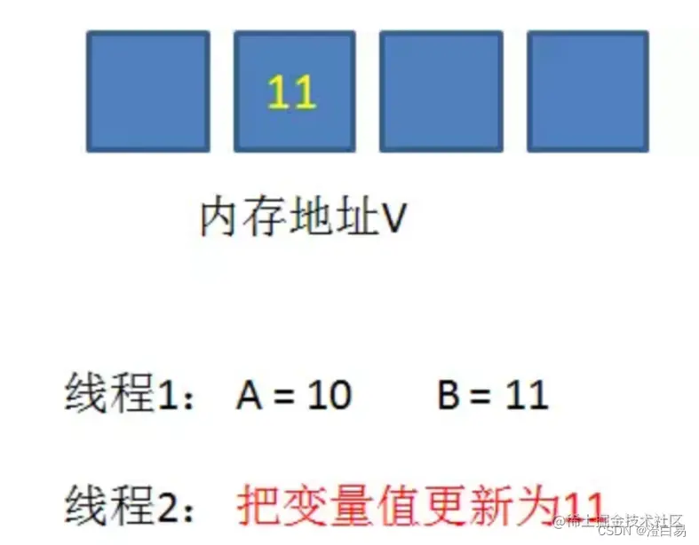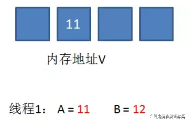 - 此时线程1想要把变量的值增加1。对线程1来说,旧的预期值A=10,要修改的新值B=11;