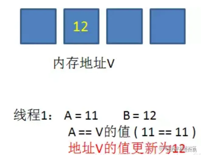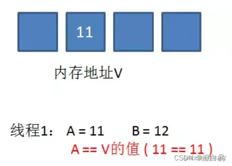 - 这一次没有其他线程修改V的值,线程1进行比较(Compare) ,发现 A == V(11 == 11);