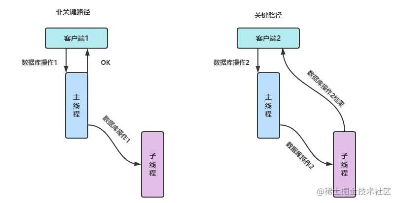 非关键路径客户端不需要使用执行操作的结果,直接返回OK给客户端就行如客户端1所示,而关键路径是客户端需要等待线程的执行结果,所以无论是主线程执行还是子线程执行都会阻塞,如客户端2所示。