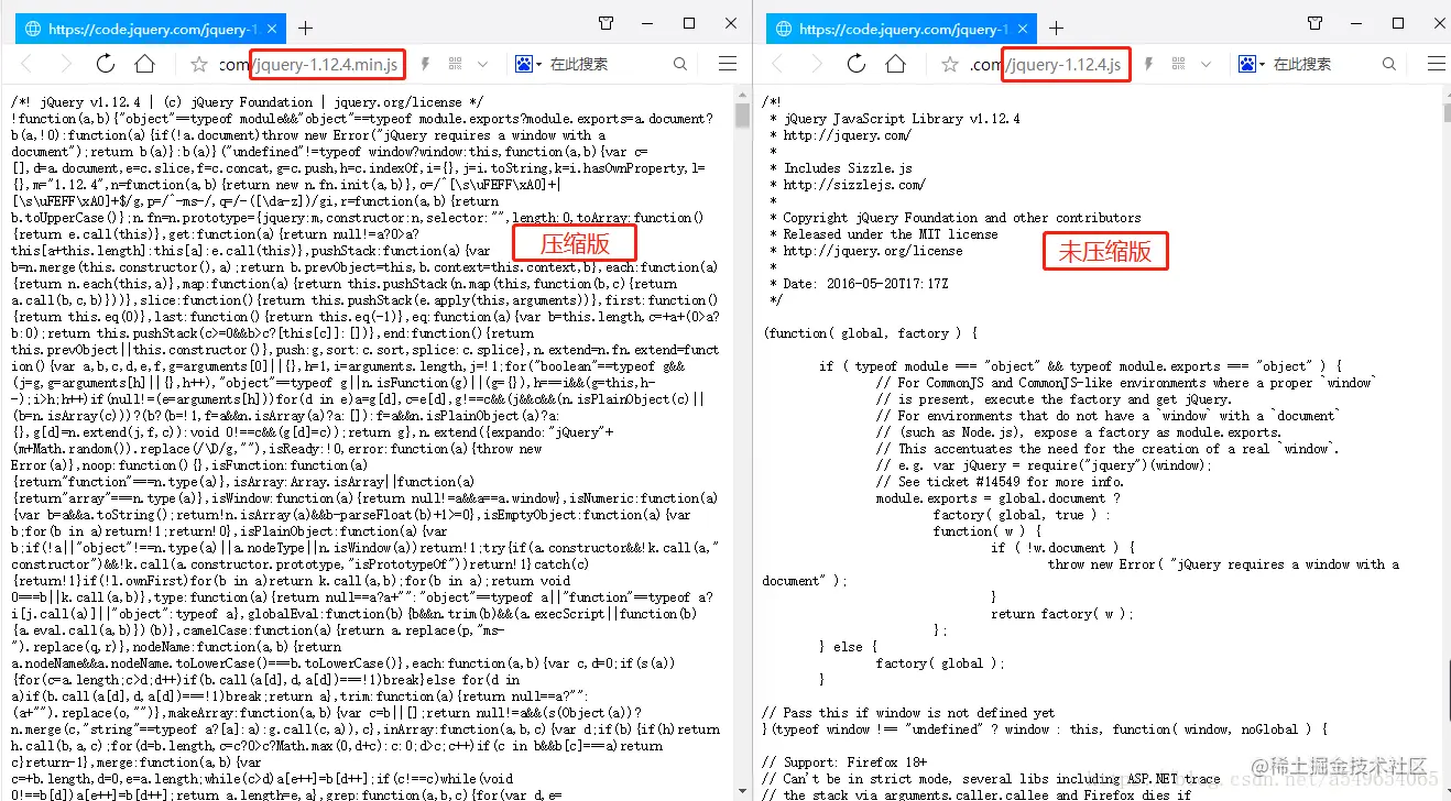 压缩版的代码删除了一些注释、空格,基本没有阅读性,所以压缩版更适合生产环境