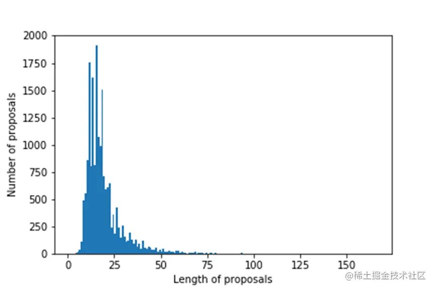 本赛题数据集中每条视频特征有不同的帧长(训练集帧长范围为4648992,其中90%的序列帧长超过8704),对于如此长且长度不统一的视频序列,将其直接输入到模型中用于训练是不现实的。我们对最初的训练集按39:1的比例进行划分,得到新的训练集与验证集。当然,可以按照其他比例如9:1进行数据集划分,但是因为我们设计的验证方案(后续会提到)在数据量较多时耗费的时间更长,因此在验证可靠性与验证时间之间做出了取舍。 训练集 参照BMN[1]论文单元3.5中Training Data Construction部分所讲,我们也以一个滑动窗口对每一个长视频序列进行切分,其中步长为窗口长度的一半,同时要注意的是我们所保留的每一个视频切片必须包含至少一个完整提案。但是滑动窗口的长度如何选取呢? 首先我们对训练集相应的动作提案标签进行分析,总共有19054个提案标签(长度范围为1831),分布如图1所示。我们设提案长度为D,当D=93时,已能够覆盖99.9%的动作提案。因此我们选择提案长度D为100,足以覆盖几乎全部的动作提案。当然为了减少训练推理时计算量,也可以选择更小的D,如D=50。正如冠军团队所说,PaddleVideo的anet_pipeline.py第50行出现错误,使得视频切片长度T与提案长度D不相等时便报错,故我们默认滑动窗口长度T与D相等,皆为100。当然,当T稍微更大时,比如T=200,可以使模型更好地建模长提案的上下文,但会带来更多的计算代价,因此T大小的选择可以在速度与性能之间进行权衡。