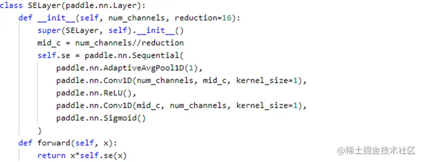 与BMN[1]模型一致,我们沿用了它的TEM模块结构,仅在第一个卷积的输入通道数有差别。当然,修改过的SE模块、non-local块等注意力机制也曾应用到两层卷积之间,但提升不大,且引入了额外的计算量,故最终方案没有采用。SE模块代码如下: