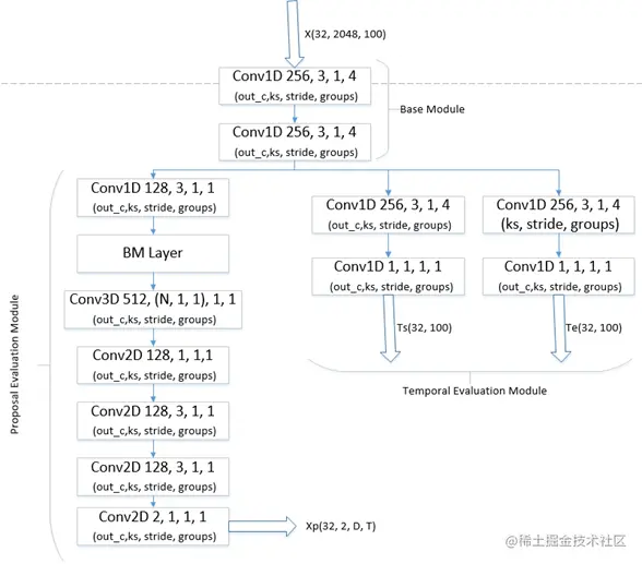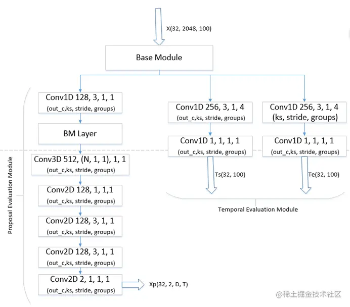 图2 BMN模型整体架构该模型由三个模块组成,基础模块(Base Module)作为主干网络处理输入的特征序列,TEM模块(Temporal Evaluation Module)预测每一个时序位置属于动作开始、动作结束的概率,PEM模块(Proposal Evaluation Module)生成BM置信度图。基于BMN[1]模型,我们对Base Module部分进行了修改,但继续沿用TEM模块和PEM模块,如图3所示。