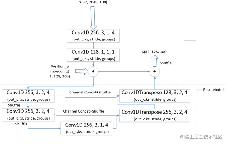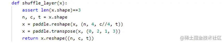为了使模型轻量,BMN[1]的基础模块使用的是两层的3x3分组卷积。由于分组之后,每通道信息只在各组中融合,而组与组之间无信息流通,会使得模型丢失一部分信息,降低模型容量。轻量化网络ShuffleNet采用Channel Shuffle操作使得信息跨组流通来解决这个问题,同样地,在这里我们也引入了Channel Shuffle操作。当然,也可以使用1x1卷积来解决,但会引入额外的参数和计算量。Channel Shuffle操作的代码如下: