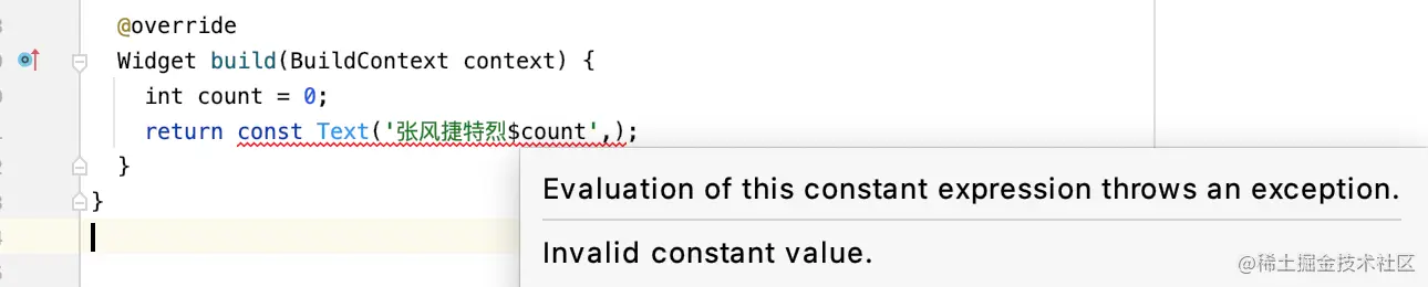 这样,对应不变的文字信息,可以使用 const 进行修饰,这样,下次 build 时这个量就可以直接使用,而非构造新的 Text 对象。Flutter 中的很多组件和属性都有 const 构造,如果它们是不变的,最好使用 const 修饰。