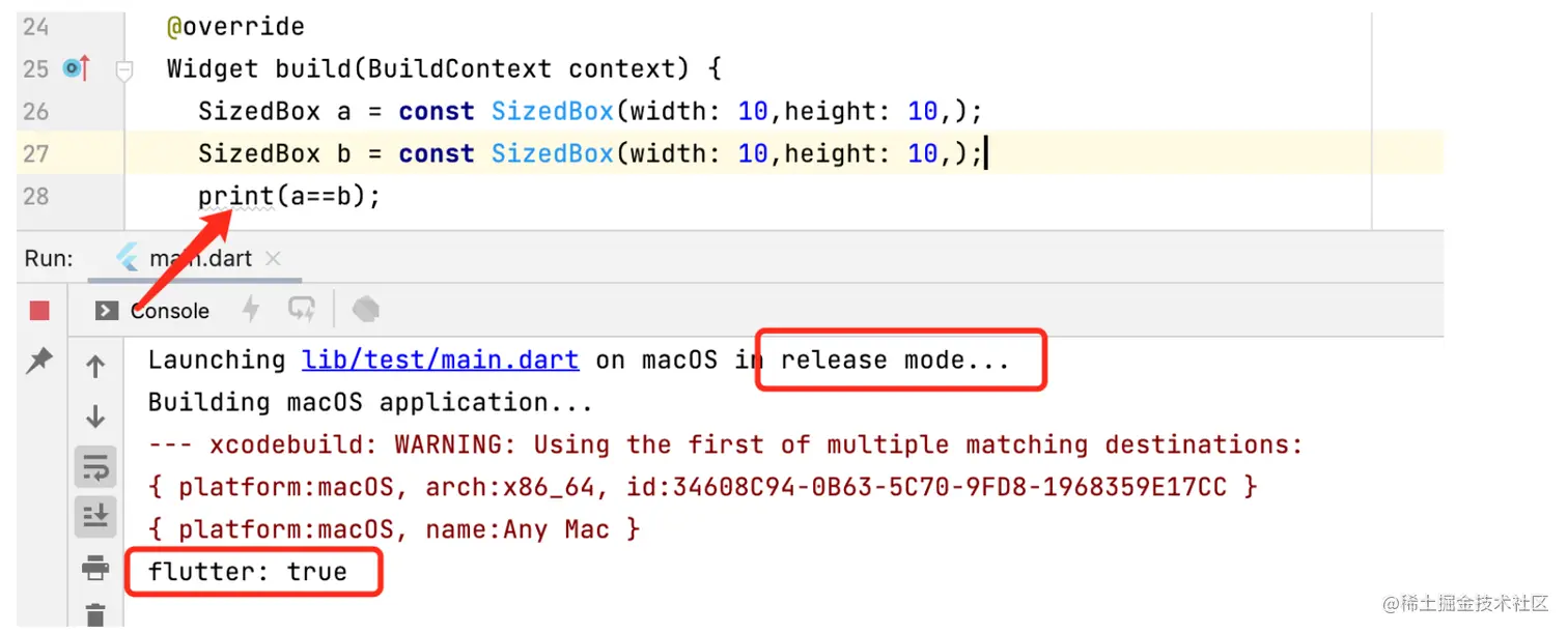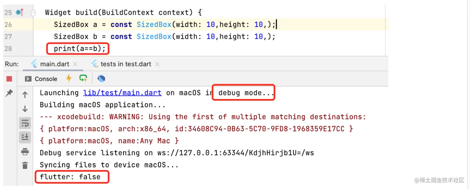 因为 debug 模式 下的 Dart 常量去重策略导致的。在官网有相关介绍文章 《调试 Flutter 应用》。其实很容易理解,在 debug 时,需要追踪 Widget 的创建时机,而 const 对象在编译期间就已经初始化了。这是 debug 模式 下的 常量去重策略的必要性。当然你可以通过如下方式来关闭这个 去重策略 ,但一般来说这并没有什么必要。
