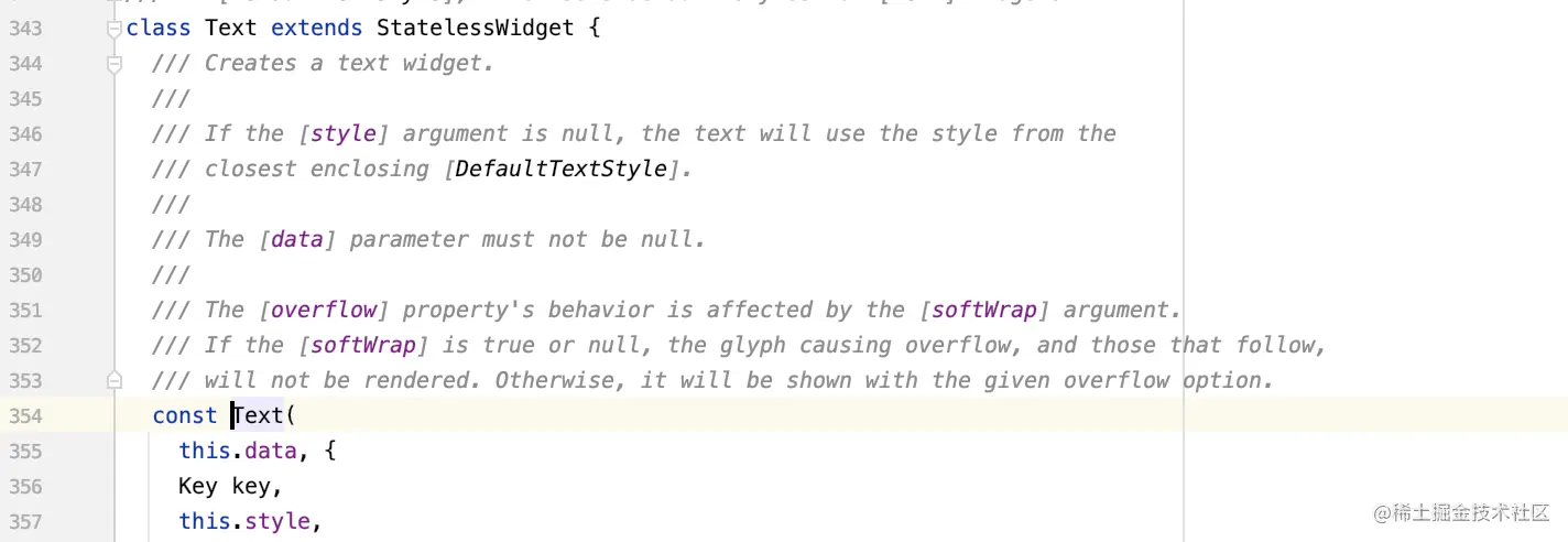 这时,你再反观 Flutter 中的一些东西,就会有更多的感悟,比如 Text 组件的构造器使用了 const 修饰,就说明 Text 对象可以使用 const 进行修饰,并且 Text 类中的所有属性都必须为 final。