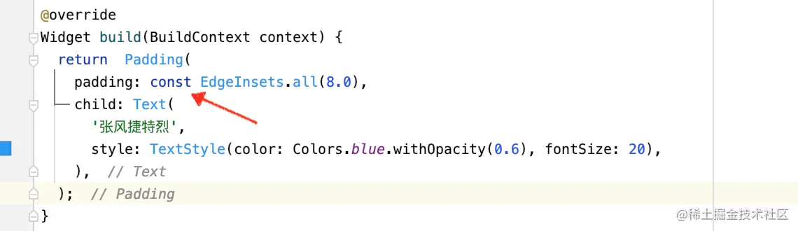 同理这里 Text 也无法使用 const 修饰,所以,只能将 const 给 EdgeInsets.all(8.0) 修饰。也就是说,能用 const 修饰的尽量用 const 修饰。