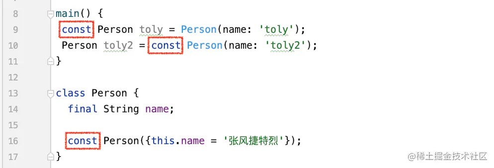 而对于非 const 创建的对象,用了 10000 次 Person(name: 'toly') ,就是创建了 10000 个对象,每个对象都占着一份空间。 所以这样看来,对于一些不变的常量,使用 const 修饰是很有价值的。