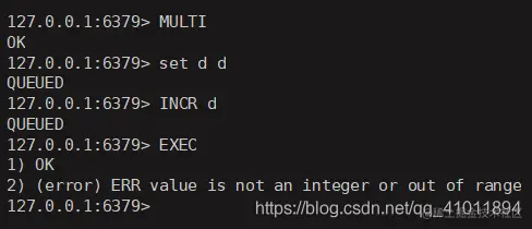 2. 如果事务中命令有误, 事务最终是不会执行的