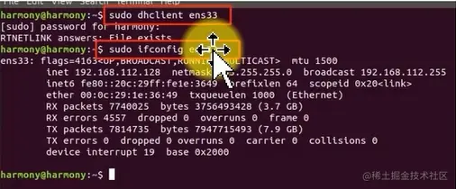 sudo dhclient ens33sudo ifconfig ens33