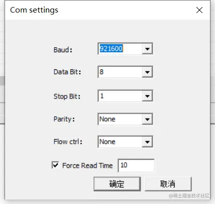 2.在 Setting --> Com settings 中设置参考下图,点击确定(波特率数值越大,传输速度越快)