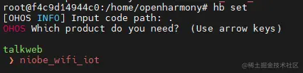 # 此时已经进入docker编译环境cd niobehb set // 设置源码目录和要编译的产品,默认回车选择当前目录,niobe默认选择的是niobe_wifi_iothb build -f