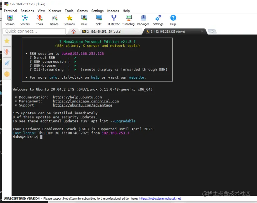 1.启动 windows 上安装好的 MobaXterm 客户端,通过 ssh 登陆上一步安装的 Ubuntu 系统,方便后续操作