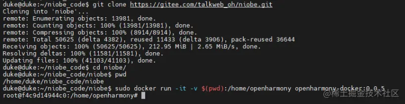openharmony官方提供支持小型系统和标准系统的docker环境,在使用时需要注意。Niobe使用的是小型系统的docker编译环境:docker-openharmony:0.0.5# 进入docker环境cd /home/yourname/niobe_codesudo docker run -it -v $(pwd):/home/openharmony docker-openharmony:0.0.5# 说明:# 如果通过Dockerfile 构建本地Docker镜像进行构建则命名是docker-openharmony:0.0.5# 否则从HuaweiCloud SWR上直接获取Docker镜像进行构建,则命名是swr.cn-south-1.myhuaweicloud.com/openharmony-docker/openharmony-docker:0.0.5# 二者构建的差异性,参考官方文档:https://gitee.com/openharmony/docs/tree/master/docker