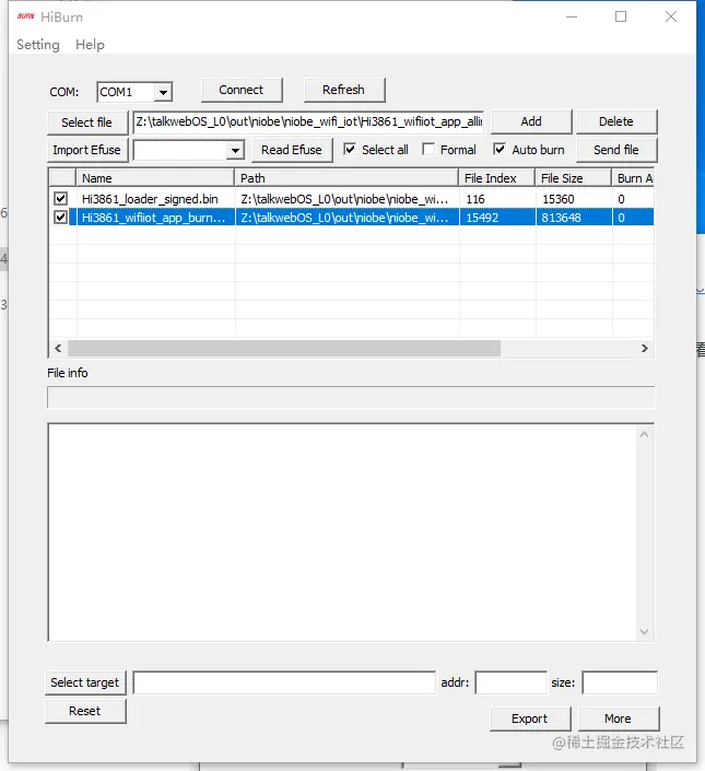 3.Hiburn 工具中烧录文件选择和配置参考下图,勾选 Auto burn 选项则是和开发板建立连接后,按下开发板上的复位(Reset)按钮后会自动烧录