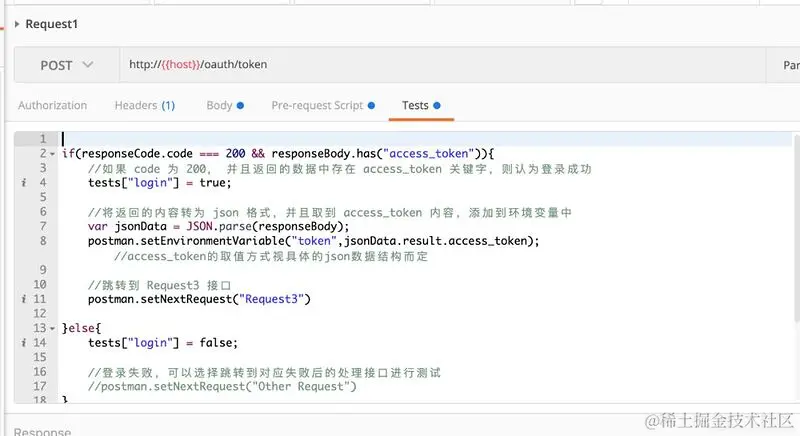 我们在运行完 Request1 接口成功后,不需要再运行 Request2 而是直接跳至 Request3 ,那么我可以在 Request1 接口的 Tests 功能区中执行跳转代码,如:\