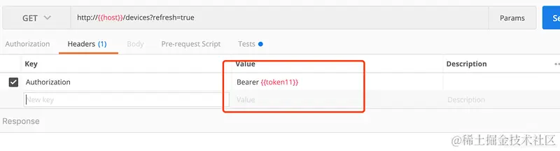 将 Request1 返回的 access_token 的值添加到环境变量"参数集"中。