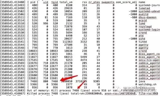 看来是 OOM Killer 主动把这两个进程给杀了。从下面的信息来看是这两个进程消耗 linux 主机的物理内存和虚拟内存太大,以致于把内存都给消耗光了,最后 OOM Killer 就站出来主持公道了:小子挺横呀,老子分给你了一亩三分地,不好好呆着,敢来抢地盘,干它!