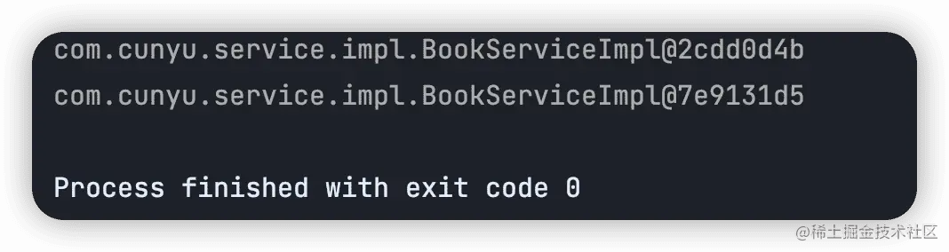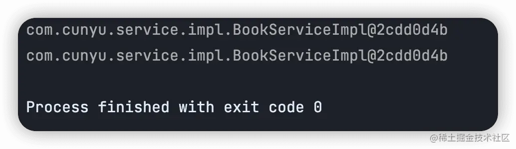 以上两种配置的效果是一致的,因为 Bean 默认的作用范围是 singleton。接着我们创建两个 BookService 对象,然后打印出来,可以看到它们指向的是同一块内存。
