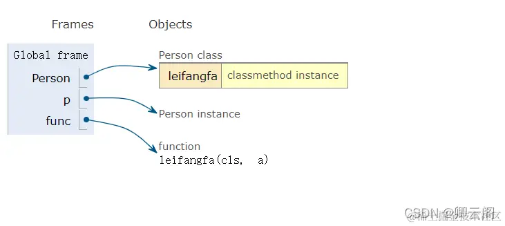**类方法、@classmethod 传递的是类对象的引用。**类方法可以被实例调用,也可以被类调用。