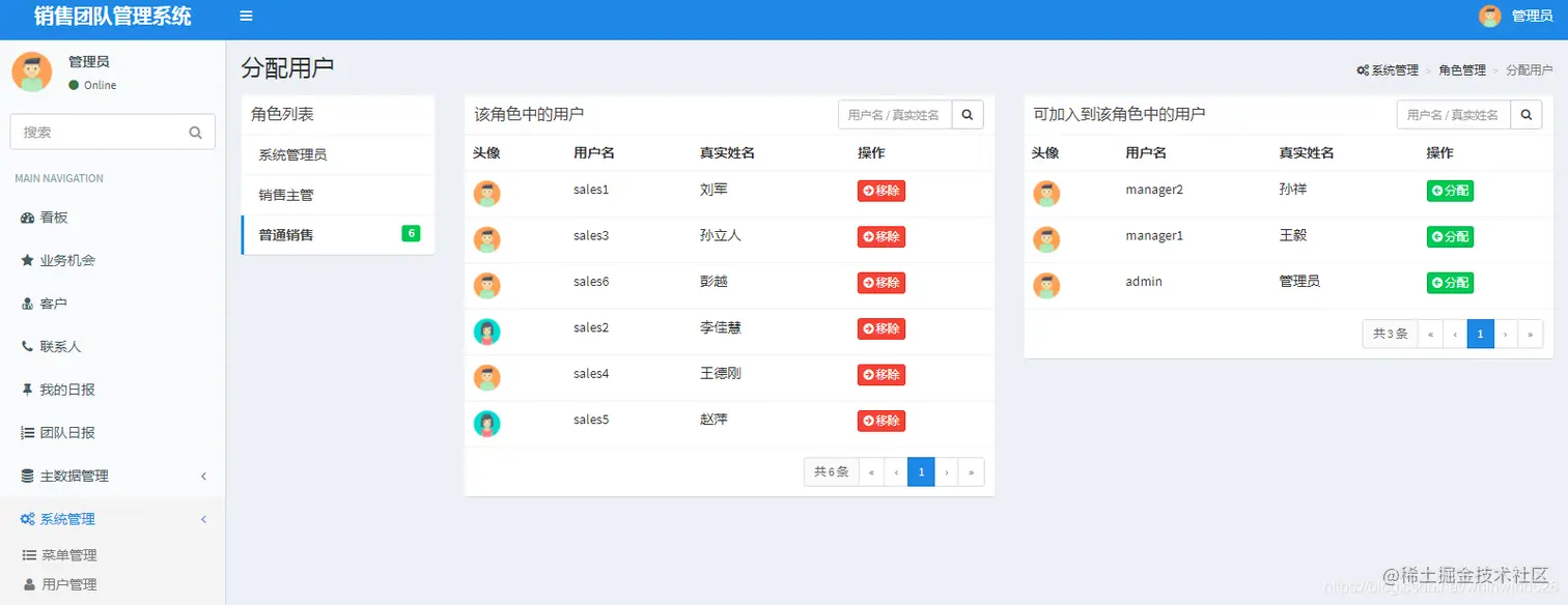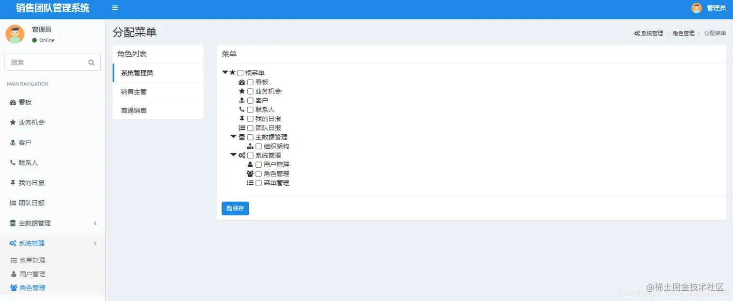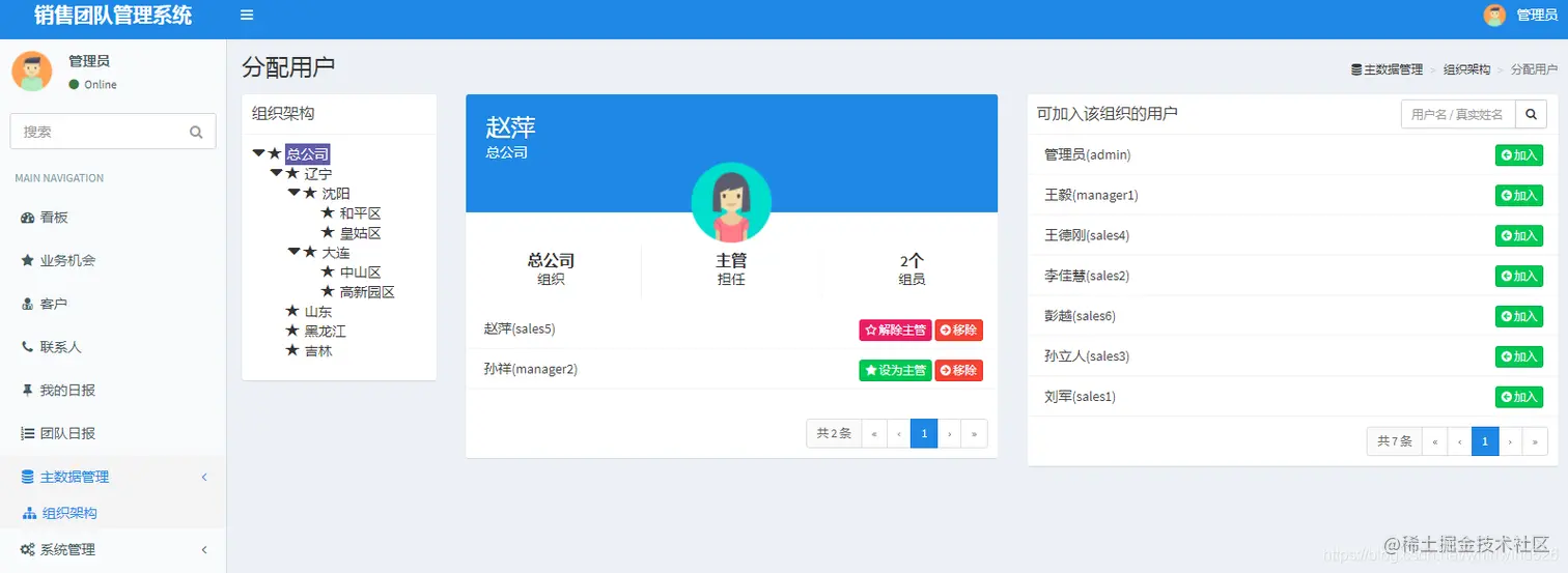 管理员具有所有操作功能,但主要是进行系统管理,业务管理交由销售员和团队领导去做