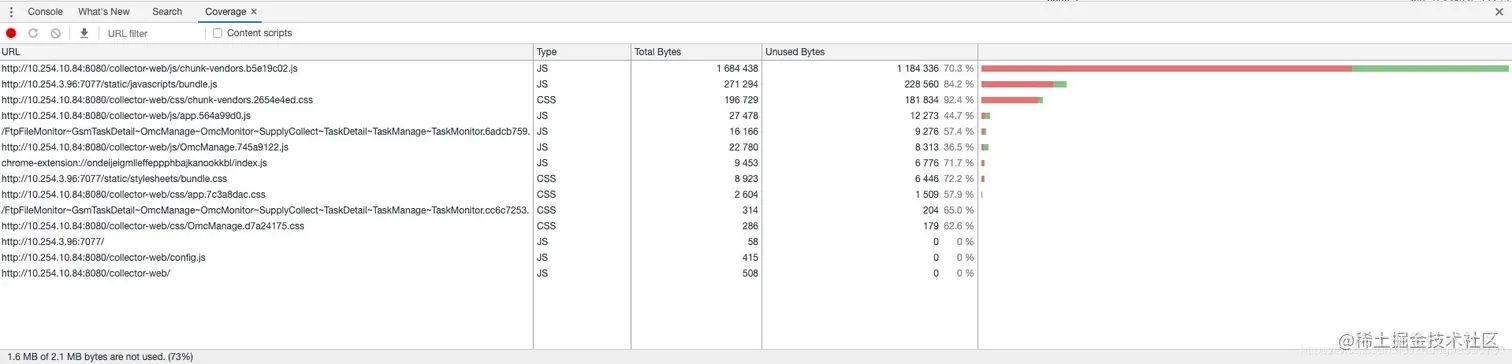 上图所示,最右边显示的是我们加载的css和js文件数量,红色区域表示已运行的代码,而青色表示已加载但未运行的代码。可用来发现页面中尚未用到的js 和 css代码,你可以为用户只提供必要的代码,这样就可以提升页面的性能。这对于找出可以进行拆分的脚本以及延迟加载非关键脚本来说非常有用。