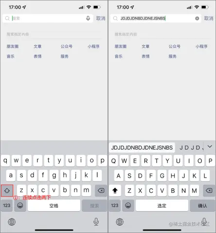 第1步:快速的点击两下【大写键】的按钮,你就会发现键盘可以已经全部变成大写的了,并且输入一个大写字母后不会变成小写。