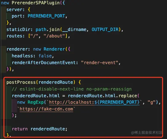 在插件的 postProcess 传入函数,将 html 内的 http://localhost:${PRERENDER_PORT}全局替换为 CDN 域名: