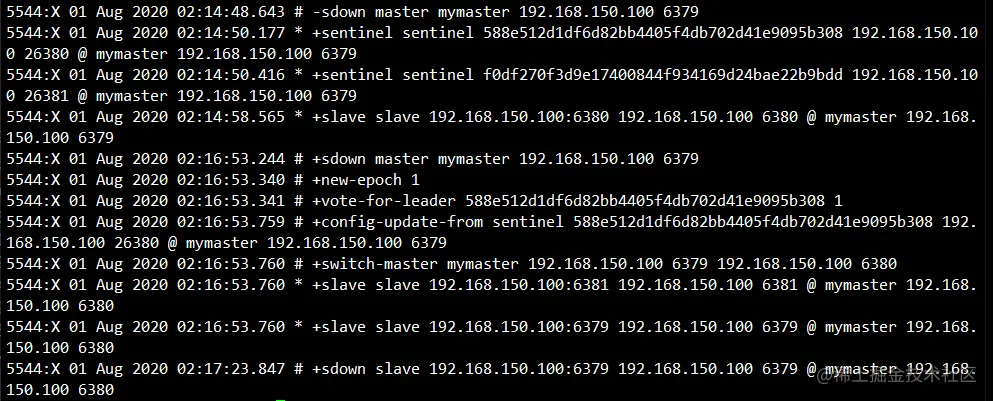 //连接池配置 JedisPoolConfig jedisPoolConfig = new JedisPoolConfig(); jedisPoolConfig.setMaxTotal(2000); jedisPoolConfig.setMaxIdle(1000); jedisPoolConfig.setMinIdle(5); //master名称 String masterName = "mymaster"; //哨兵 HashSet<String> hashSet = new HashSet<>(); hashSet.add(new HostAndPort("192.168.150.100", 26379).toString()); hashSet.add(new HostAndPort("192.168.150.100", 26380).toString()); hashSet.add(new HostAndPort("192.168.150.100", 26381).toString()); //创建连接池 JedisSentinelPool jedisSentinelPool = new JedisSentinelPool(masterName, hashSet, jedisPoolConfig, 3000, null); Jedis jedis = null; int i = 1; while (true) { try { jedis = jedisSentinelPool.getResource(); jedis.set("sentinel" + i, "sentinel" + i); System.out.println("sentinel" + i); i++; Thread.sleep(3000); } catch (Exception e) { e.printStackTrace(); } } }- 在哨兵的日志中可以看到判断下线以及投票,设置新的master的一个过程,java客户端当6379被干掉持续请求,但是连接被拒绝,直到新的master被分配处理请求新的master