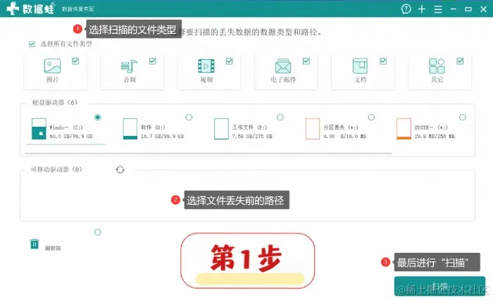 第2步:在首页按照实际情况,选择丢失的文件类型还有它的存储位置后即可“扫描”;