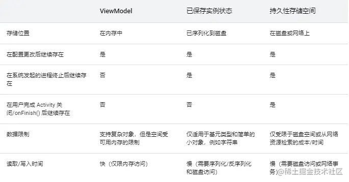 怎么说?除了这两种存储恢复数据的方式外,还有一种 持久化存储,官方文档 《保存界面状态》 提供了一个维度参考表:
