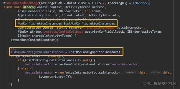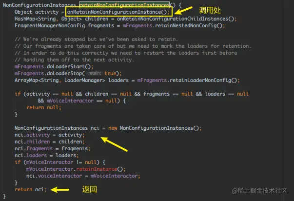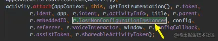 销毁时,先存到 ActivityClientRecord.lastNonConfigurationInstances 中,然后在Activity启动时,通过 attach() 方法传递给新Activity。
