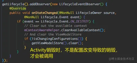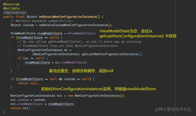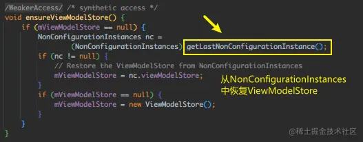就是在配置更改销毁重建过程中,先调用 onRetainNonConfigurationInstance() 保存 旧Activity中的ViewModelStore实例,重建后通过 getLastNonConfigurationInstance() 获取到之前保存的ViewModelStore实例。